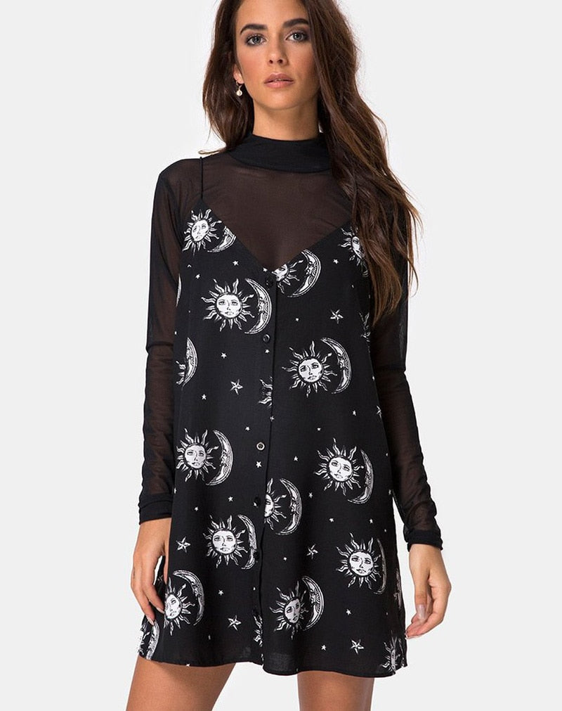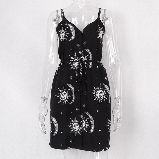 • Let's wait until it's dark to chase the stars of the Yanka dress! This skater dress features a soft stretchy fabric and a belt to strap you in. Completed with a star and moon graphics that add all the texture.